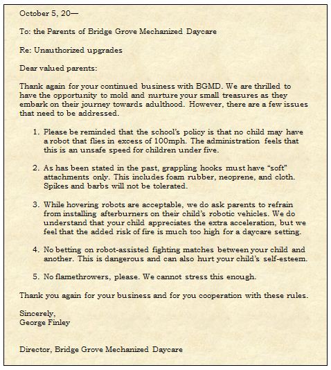 Warren didn’t seem too happy either now that he could not always get the first toy or jump over everyone to get to the lunch line first. One day, when his parents dropped him off, he was sitting in a new hover chair that floated a foot off the ground. After that, it was total war. The daycare finally capitulated and changed its name to Bridge Grove Mechanized Daycare.