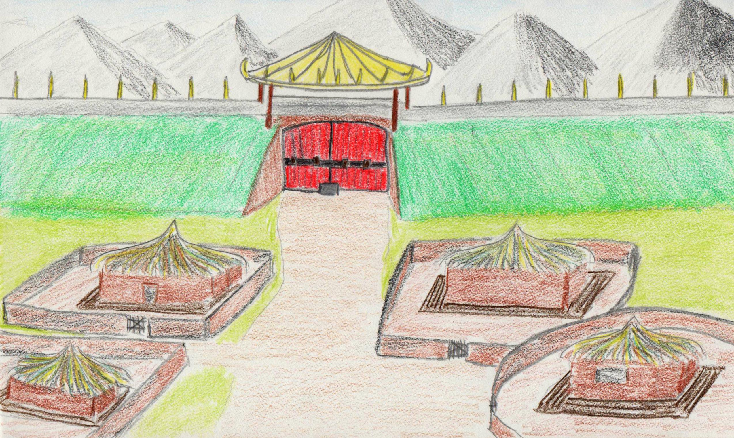 Not even two minutes later, we came to a sort of village. The houses here were similar to the old woman’s house I had visited earlier that morning but beyond them, I saw a stone wall rising up above the roofs. It had to be at least fifteen feet tall and was tipped with what looked like golden spikes. It continued out of sight, both left and right across the valley and I could see that we were on the inside of the wall. Somehow, I had come down in the middle of a mountain fortress.