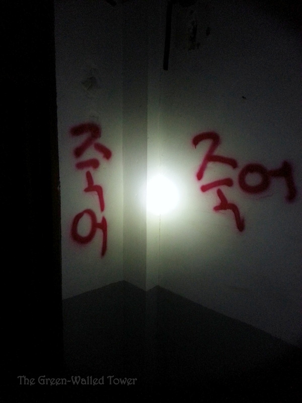 Last Friday night, we went to the Chung-il Girl’s High School, in Daejeon, South Korea, which was closed in 2006. It’s reportedly haunted and I’ve seen some pretty shaky evidence, but it is a huge structure: 5 stories plus the basement, holding 3000 students at its height. We went after work on Friday and got to the school about 9pm. There were spray-painted signs on the entrance saying things like “Forbidden” and “You must not enter” but we did anyway (of course).