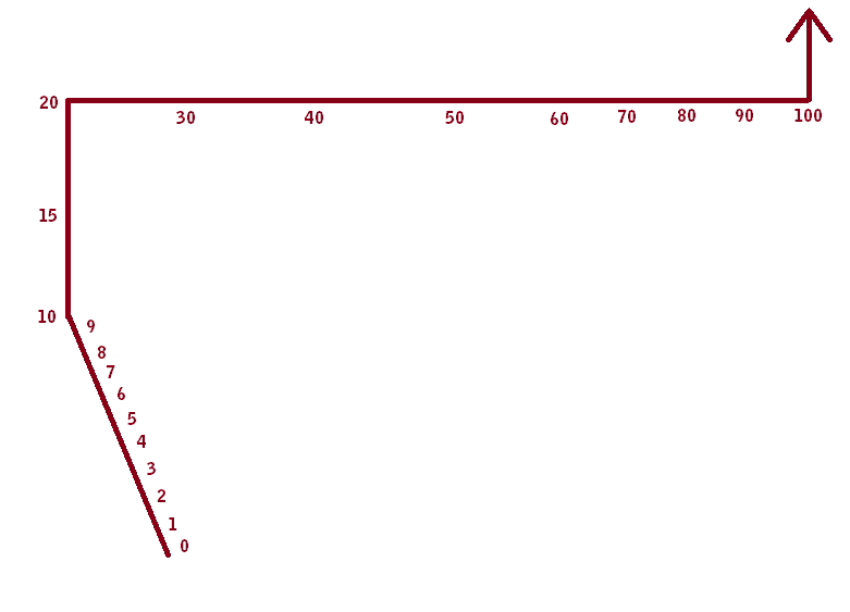 Visualization - NumbersThis is generally how I picture most numbers. There is a bend at ten and a big one at twenty and then at 100. The problem with this one is that it is also 3-dimensional, but you get the idea.