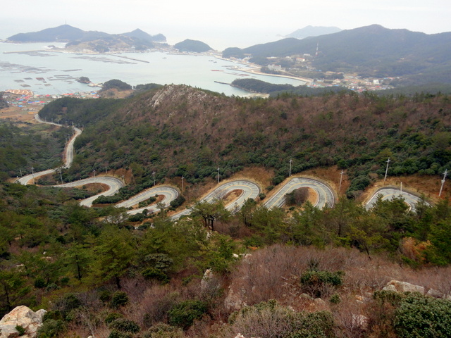 fast ferryOn the first island, I took a bus around the island on a road that wound up and down mountains on hairpin turns and steep grades. Between the cliffs and mountains, were tiny, idyllic coves with fishing villages.CoveHere is one of the roads. This one is famous on the island and has twelves switchbacks in a row. It was quite something going up this in a bus.